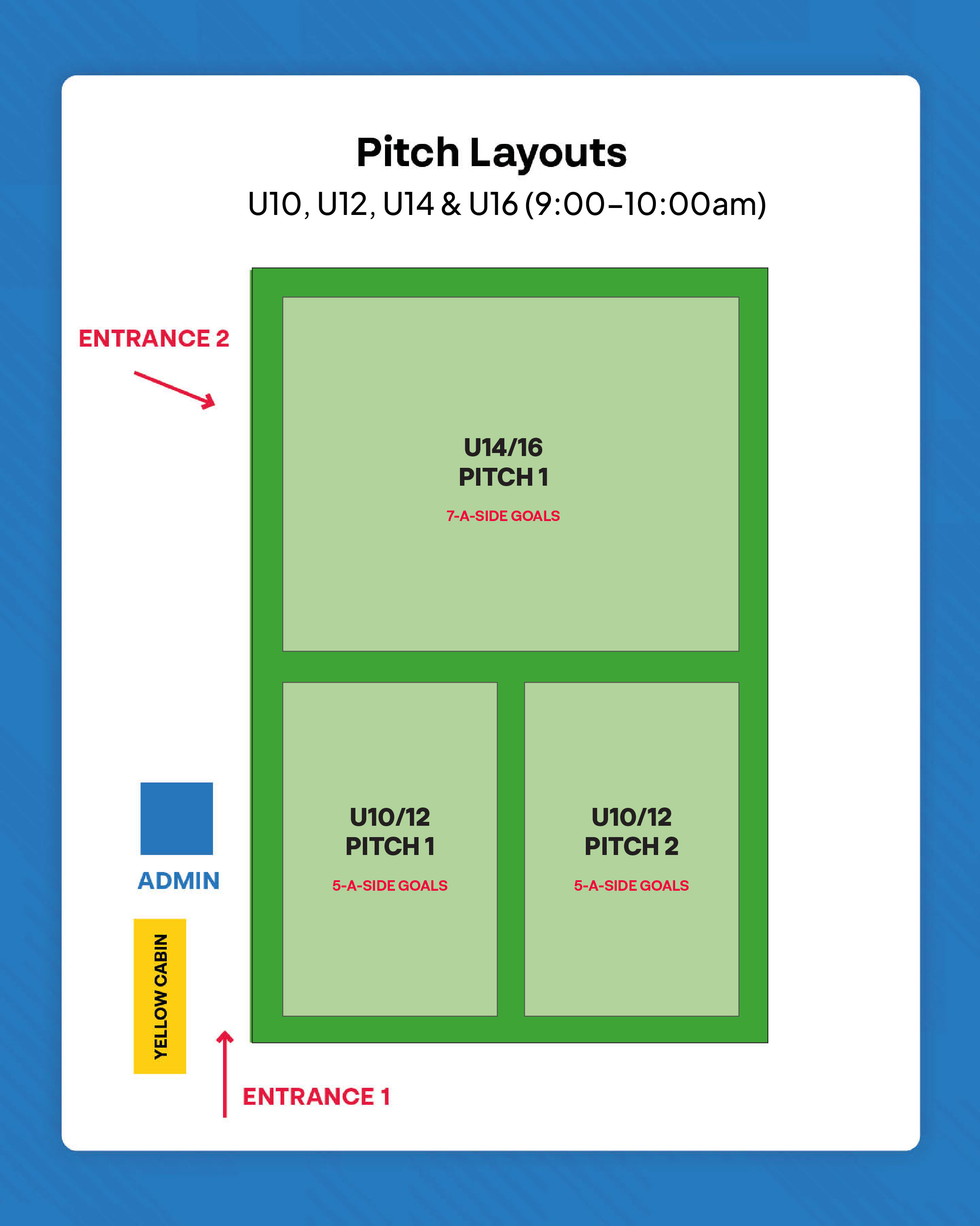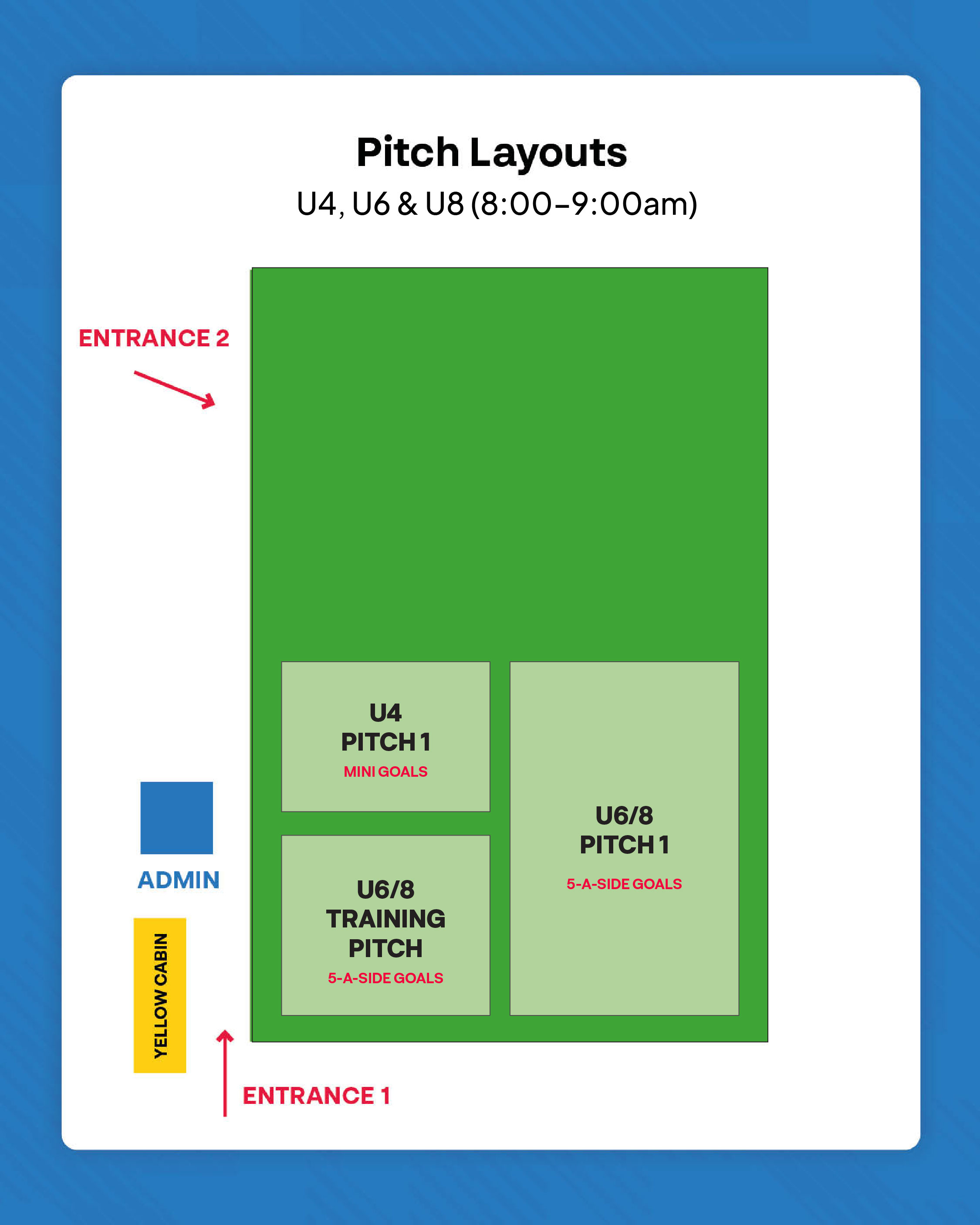 Matches are played on the far side field, with dedicated pitches set up for each age group. Check the map below for directions to the field or scroll down for this month's pitch layouts.